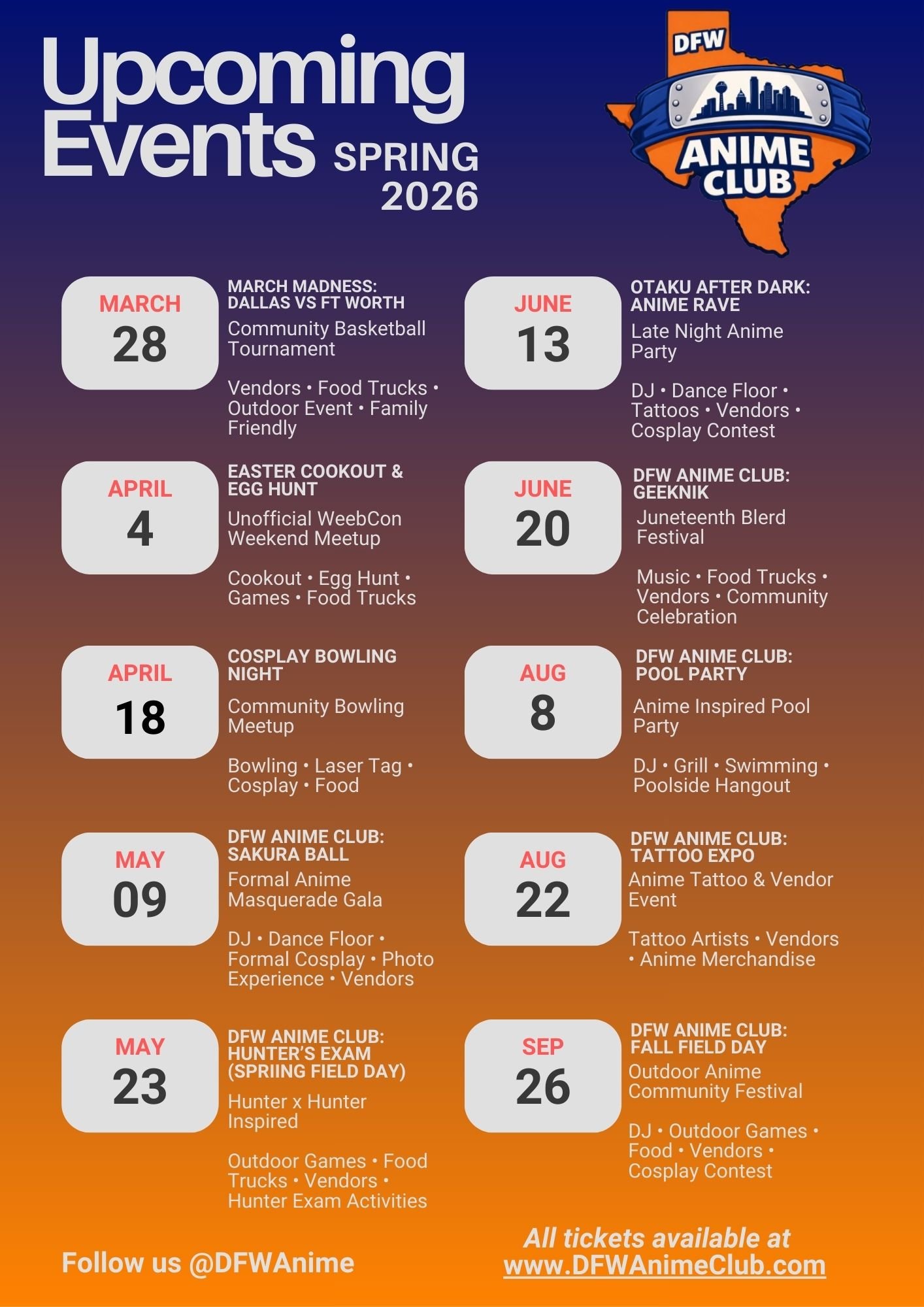 Anime & Gaming community serving the Dallas-Fort Worth Metroplex Upcoming Events 〰️ Upcoming Events 〰️ Upcoming Events 〰️ Spring 2026 Anchor Events Kid Tickets Adult Tickets Subscribe Sign up with your email address to receive the latest club news and updates. Email Address Sign Up Thank you! Follow us on social media Follow us Now